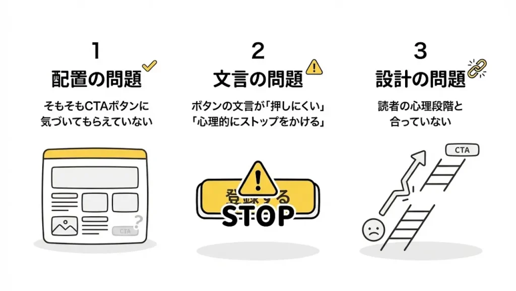お客様に行動を促すCTAというパーツがうまく機能しない原因は、大きく分けて3つあります。 一つずつ見ていきましょう。