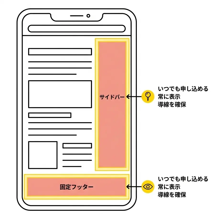 モバイル対応: スマホでは固定フッターが特に効果的です。サイドバーはスマホでは下に流れてしまうので、画面下部に固定されたCTAボタンを表示させましょう。